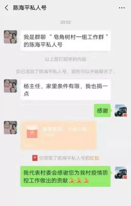 陈海平,皂角树村普通村民,“家里条件有限,我也捐赠一点”,他从微信给村干部转去两百元钱……