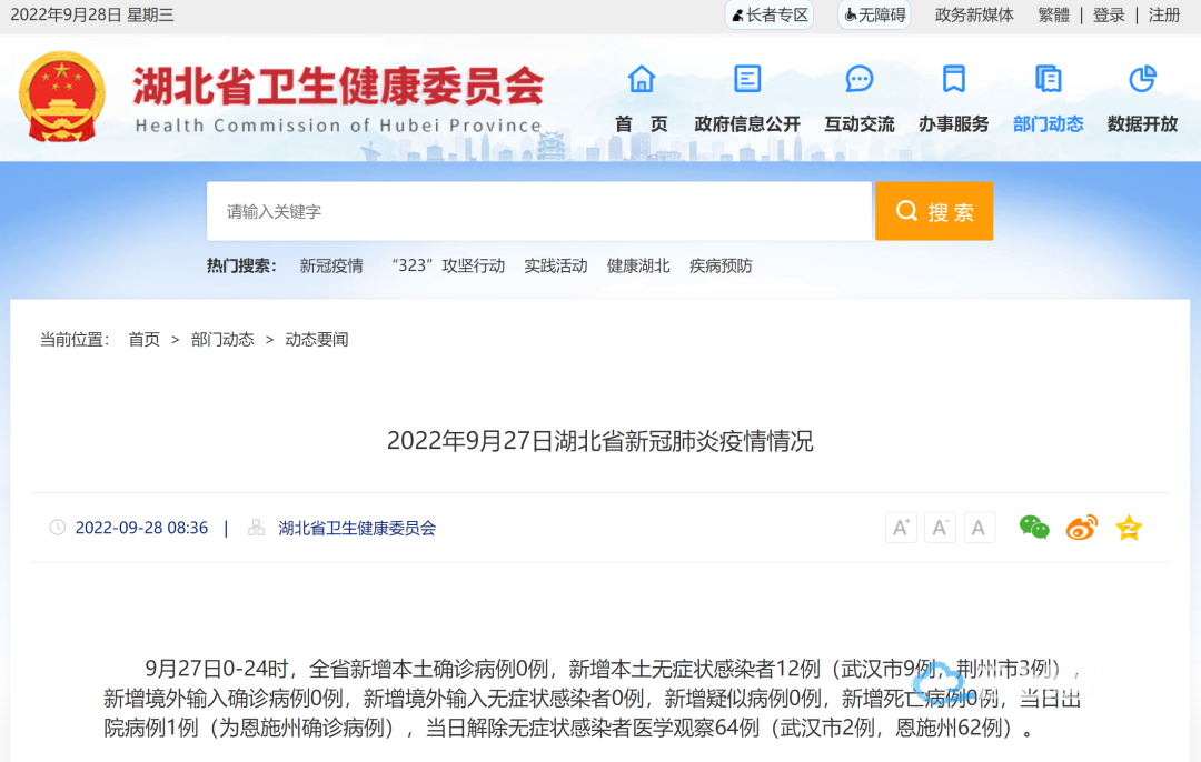 刚刚,湖北省卫生健康委员会官网发布《2022年9月27日湖北省新冠肺炎疫情情况》,全文如下: