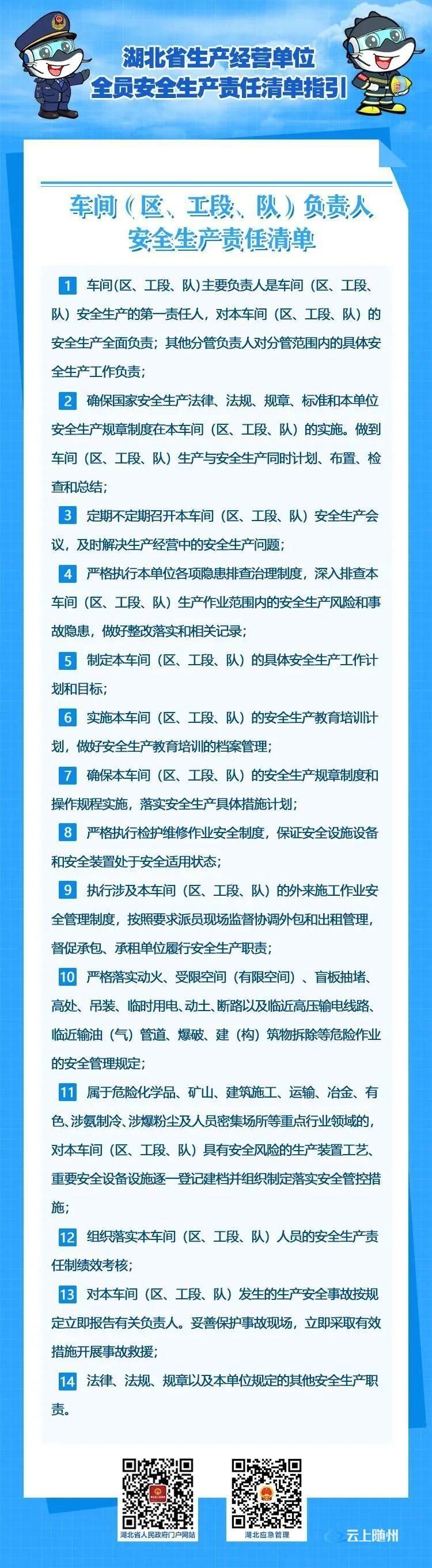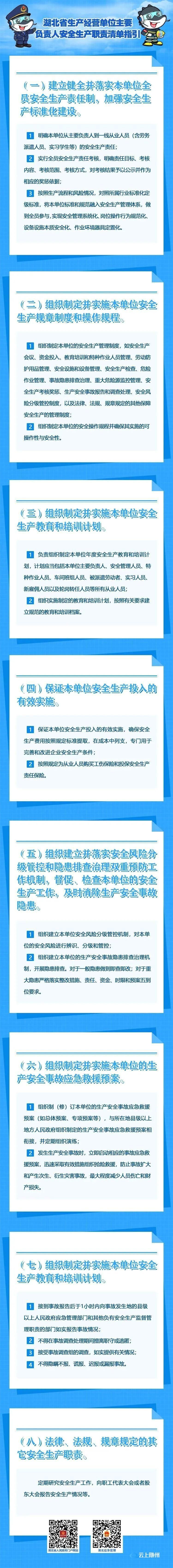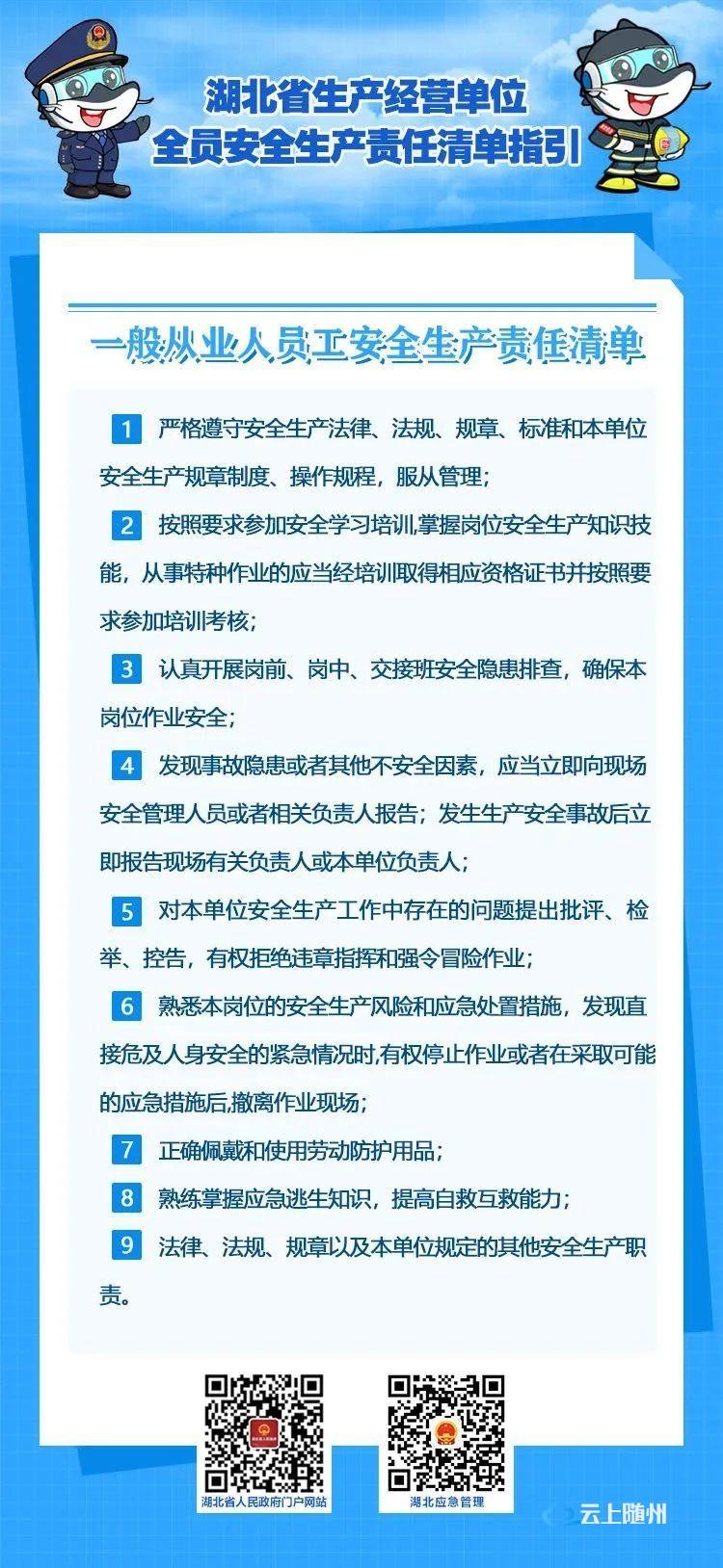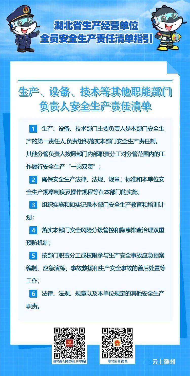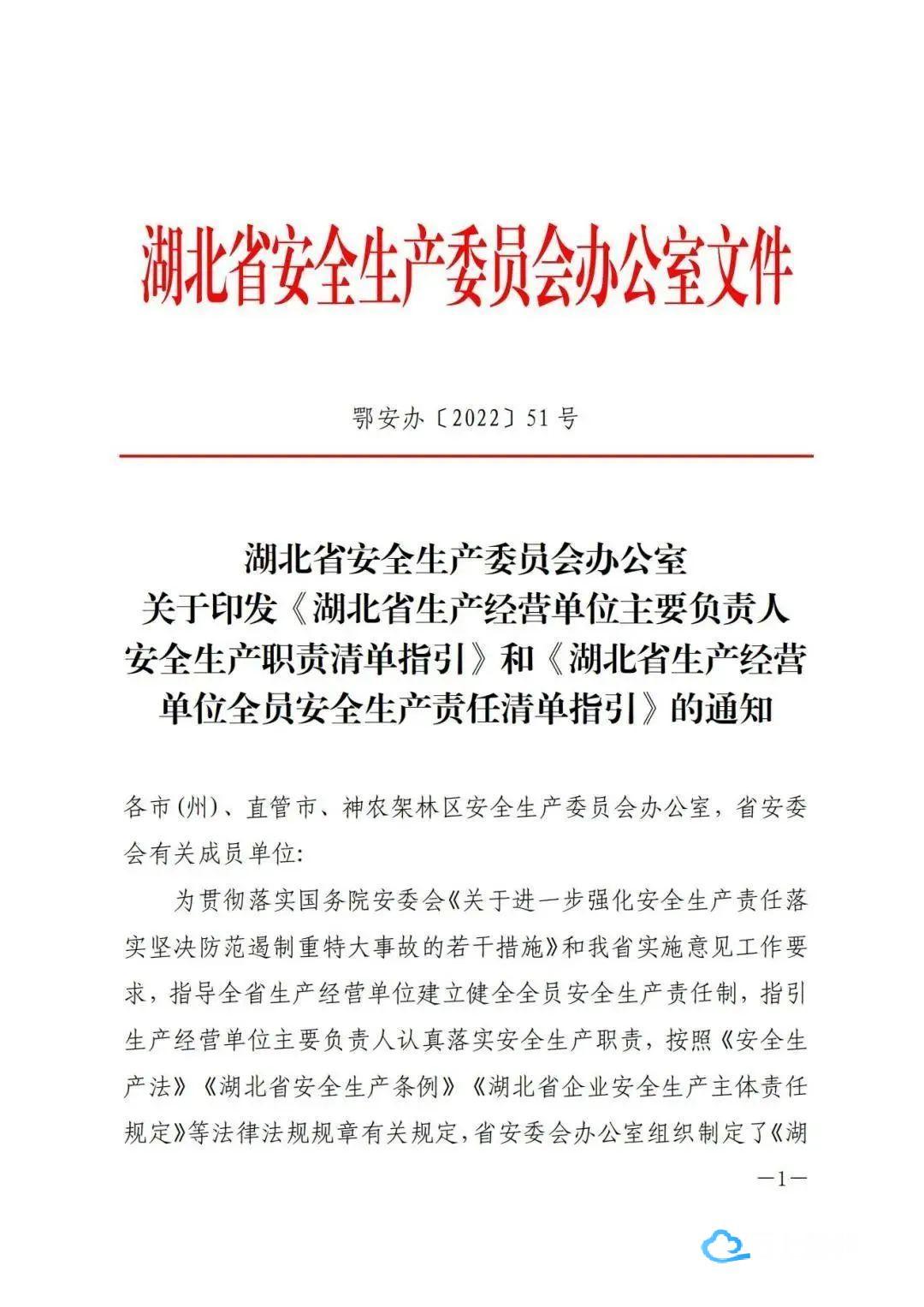 2022年10月21日,湖北省安委办印发《湖北省生产经营单位主要负责人安全生产职责清单指引》和《湖北省生产经营单位全员安全生产责任清单指引》,这是落实企业主体责任,全面加强安全生产监管的具体举措,对推动全省安全生产形势稳定好转,具有重要意义。