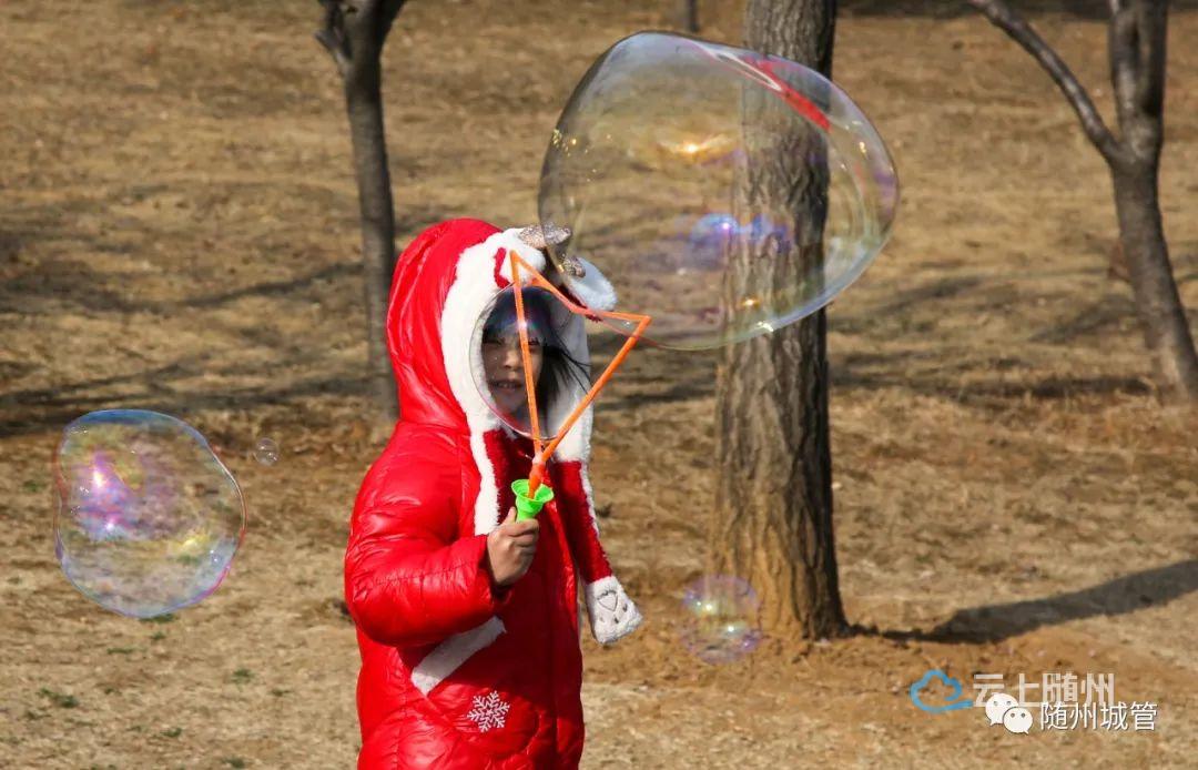 在和煦的阳光下,带着欢乐的风筝腾空而起;在持续的挥动中,一串串七彩斑斓的气泡美丽绽放。人们悠闲地漫步,孩子们快乐地嬉闹奔跑,公园成为人们释放炽烈情感的海洋。