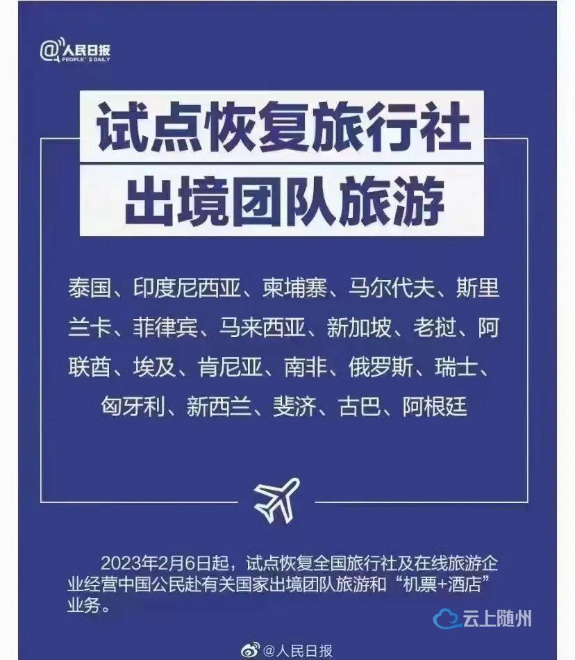 近日文旅部发布通知宣布自2023年2月6日起试点恢复全国旅行社及在线旅游企业经营中国公民赴有关国家出境团队旅游和“机票+酒店”业务国家名单包括:泰国、印度尼西亚、柬埔寨、马尔代夫、斯里兰卡、菲律宾、马来西亚、新加坡、老挝、阿联酋、埃及、肯尼亚、南非、俄罗斯、瑞士、匈牙利、新西兰、斐济、古巴、阿根廷。