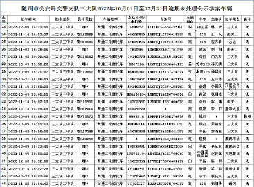 1、以下64台车辆在2022年10月01日至2022年12月31日期间因涉及道路交通违法,已被公安交通管理部门依法扣留,其驾驶人、所有人和管理人均未按规定期限到公安交通管理部门接受处理。根据《中华人民共和国道路交通安全法》第一百一十二条、《中华人民共和国道路交通安全法实施条例》第一百零七条等相关法律法规的规定,现予以公告。自本公告发布之日起经过三个月,当事人仍不前来接受处理的,公安交通管理部门将对扣留的车辆依法处理。