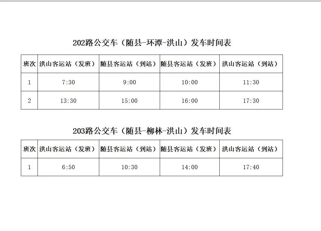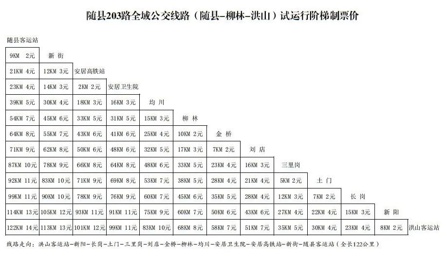 据随县城乡融合建设发展有限公司总经理郭远洋介绍,两条线路起点都从洪山镇客运站出发,终点到达随县客运站,当天往返。其中202线路全长66公里,全程票价8元,途经新街镇、安居高铁站、澴潭镇、郧阳;203线路全长122公里,全程票价14元,途经新街镇、安居高铁站、安居卫生院、均川镇、柳林镇、金桥、刘店、三里岗镇、土门、长岗镇、新阳。