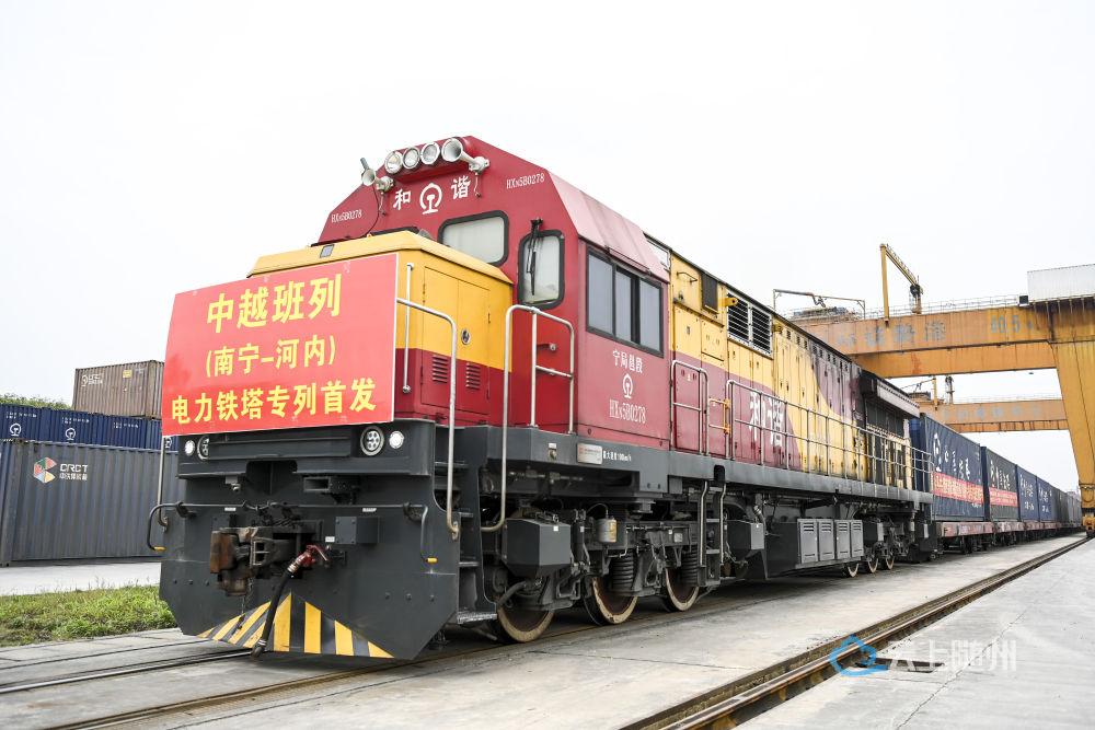2024年3月8日,在南宁国际铁路港,一列中越班列准备发往越南河内。西部陆海新通道铁海联运班列和中欧班列、中越班列、中老铁路等相互衔接联通,搭建起“多向延伸、海陆互联”的运输服务网络,中国西部地区面向东盟的国际大通道日趋通达。