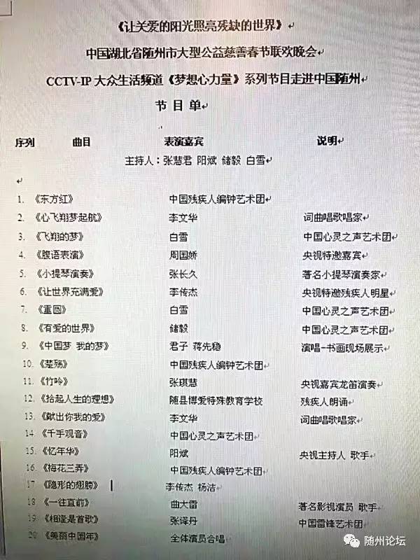 本次春晚由CCTV-IP电视大众生活频道和市慈善总会、市文体广电局联合主办,曾都区爱心职业培训学校、随县博爱特殊教育学校承办。晚会以“让关爱的阳光照亮残缺的世界”为主题,在绚烂中不失温情,在热烈中充满感动。