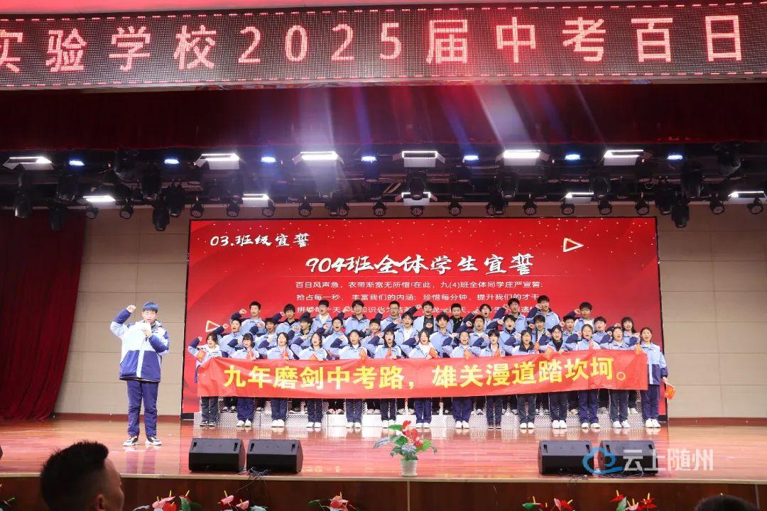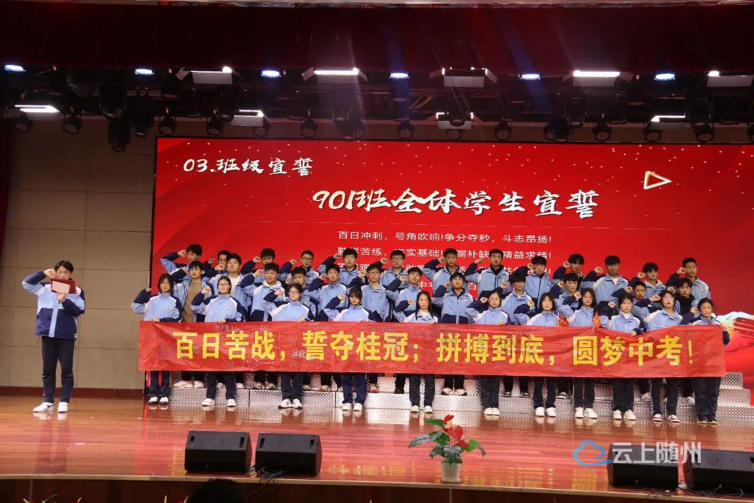 每位同学都豪情满怀,志气昂扬。声声誓言激荡校园,震天撼地,响彻苍穹。铿锵有力的誓词,瞬间点燃全场,奏响备战中考,拼搏百日的集结号!