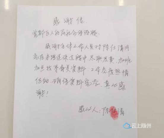 近日,曾都区人社局社保股迎来了一份特殊的“礼物”——办事群众陈仕清亲手送来的感谢信。字里行间满含真挚谢意,不仅点赞了社保股工作人员在办理退休业务过程中展现出的尽职尽责、热情耐心与细致严谨,更让这支扎根服务一线的队伍感受到了群众认可的温暖力量。