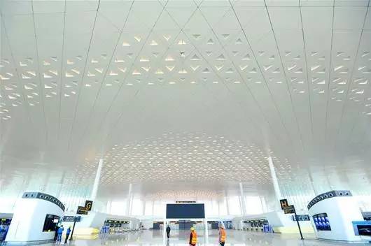 抬头向上看,T3航站楼内吊顶为菱形镂空状,结合屋面天窗构图形式,在天窗区域嵌入三角形穿孔板。据介绍,这样的设计既可将自然光理性引入大厅内,还可将天花板上的灯光层层过滤,引入室内,营造星河璀璨的室内景观,体现荆楚文化的恢宏气质和浪漫情怀。“烟感报警系统也进行了升级。”上述负责人说,T3航站楼室内最高处为20米,常规烟感报警系统无法达到要求。所以,航站楼大吊顶内部都采用空气采样报警设备,原理是探测器由吸气泵通过采样管,对防火分区内的空气进行采样。空气采样到主机,再由里面的激光枪分析,得出空气中烟雾粒子的浓度,若超过预定值主机就报警,能尽早发现火情。