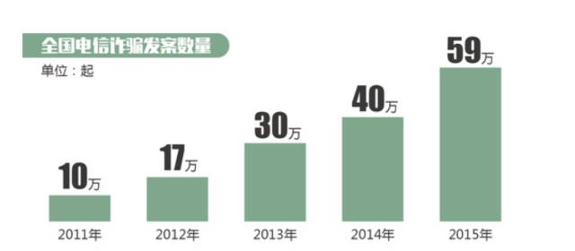 近年来,电信网络诈骗持续高发,从2011年至2015年,全国电信诈骗案件数量从10万件飙升至约60万件。据统计,仅2016年1月至7月,因电信诈骗造成的经济损失就高达114.2亿元。