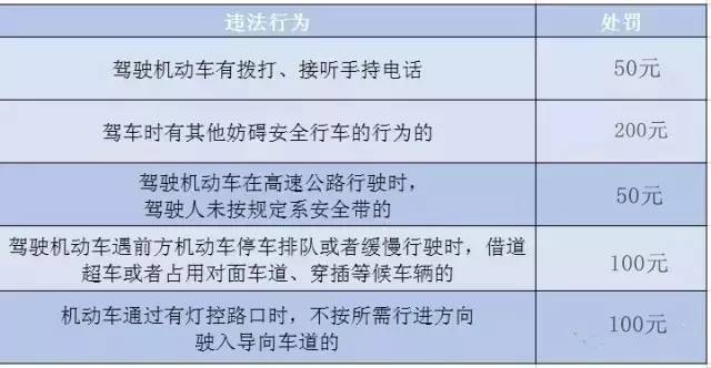 三、开车打手机(罚50元、记2分);开车不系安全带(罚50元,高速路或城市快速路还要记2分)