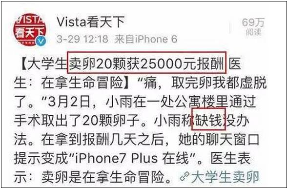 如今,少女卖卵子的案例已经不是个案。此前据媒体报道,23岁的小雨在地下市场靠出卖自己的卵子获得了2万5千元报酬。小雨表示,“我是真的缺钱,没办法。”就在拿到报酬几天之后,暗访记者发现她的聊天窗口提示变成“iPhone7 Plus 在线”。从头到尾,没有人提示过她取卵手术的风险。