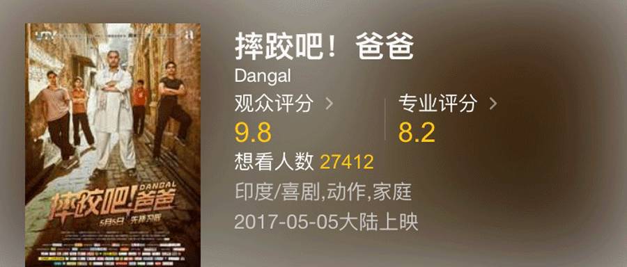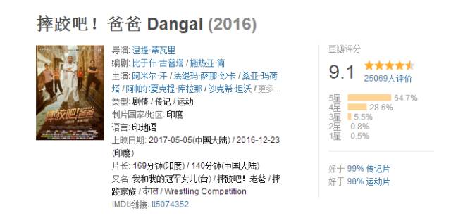 这部电影就是《摔跤吧,爸爸!》,昨日已登陆全国院线,目前在豆瓣评分高达9.1。