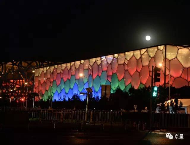 奥林匹克公园的鸟巢和玲珑塔在水一方,艳丽妖娆。
