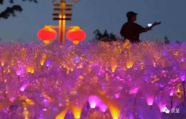 大剧院前,近2300平米的草地上布满各种小喷泉造型的光纤灯管,风中摇摆,如同花海。