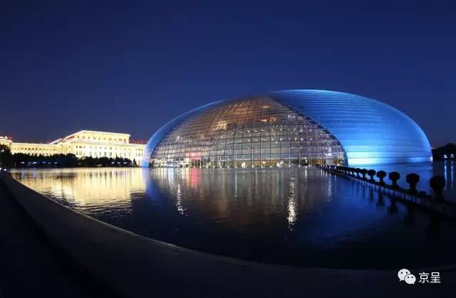 国家大剧院在外部景观灯和激光的照射下,变换着各种不同的色彩。