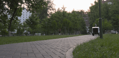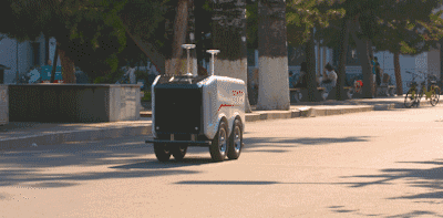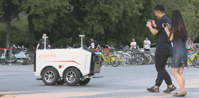 它的工作流程是这样的:配送人员先将相应订单放到无人车的箱子内,无人车会根据订单信息自动选定配送路径,然后按照路径规划自动行驶,并确定订单停车站点。在距配送点100米位置时,发送短信给收货人。
