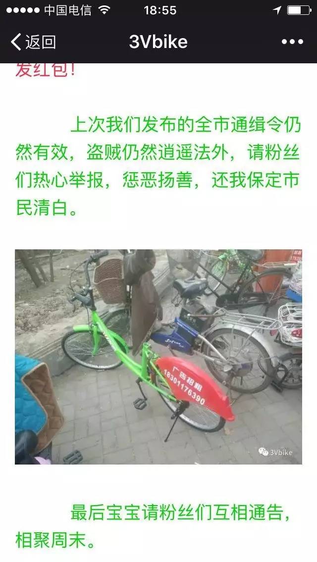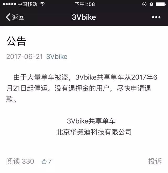 6月21日,3Vbike在微信订阅号上宣布,由于单车大量被盗,即日起停止运营,并提醒没有退押金的用户尽快申请退款