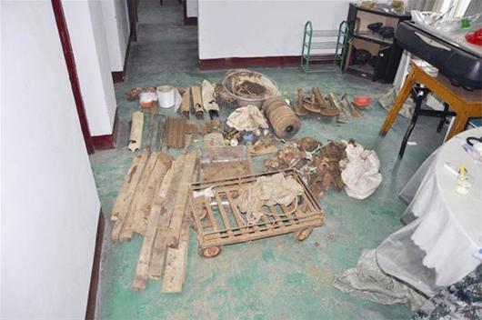 10月16日,有些郁闷的盗墓贼在里面狠狠地跺了一脚,居然发现了硬邦邦的器物,仔细一看,居然是青铜器。次日上午,赵某等人共盗掘出大件完整青铜器18件(组)、零碎青铜车马饰件52个、玉器7件。