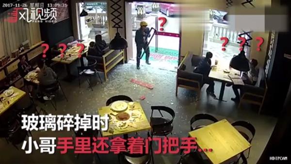上周日,某餐馆监控视频记录下尴尬一幕,一位外卖小哥一路小跑进店里,结果一下撞碎了玻璃门,外卖小哥当场愣了足足10秒,手中还攥着门把手,周围食客一样一脸懵:刚刚发生了啥???