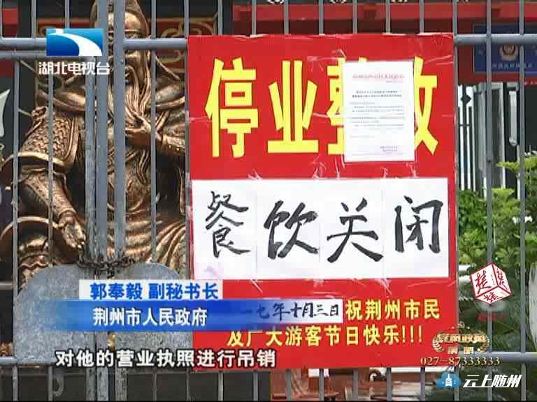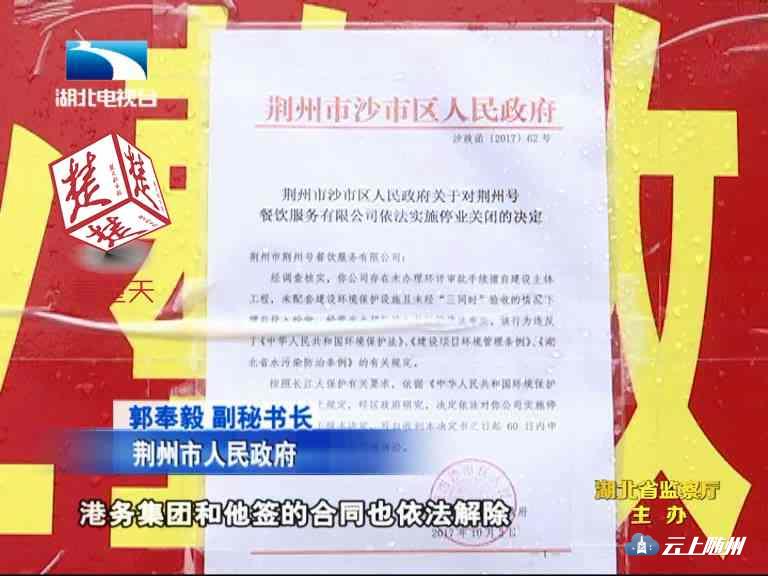 荆州市政府副秘书长郭奉毅介绍,沙市区人民政府在10月2号专门出了通告,环保部门依法查封,港务集团与餐厅签的合同也依法解除。工商部门依据有关的法律法规,对其营业执照进行吊销。