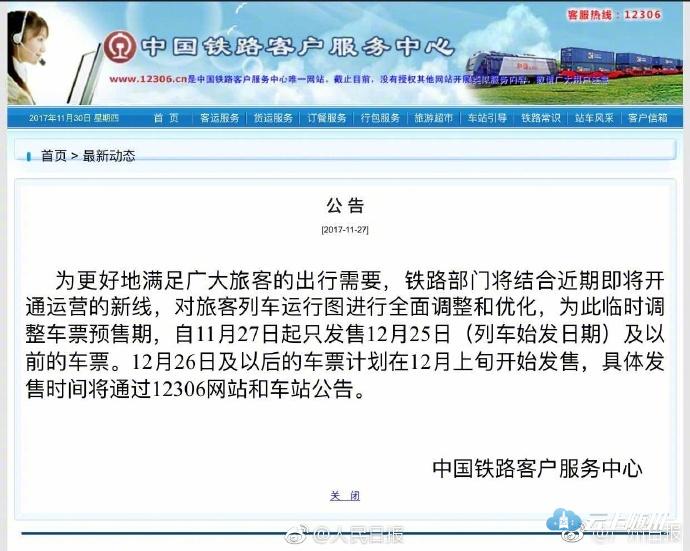铁路部门将对旅客列车运行图进行全面调整优化,为此临时调整车票预售期,自11月27日起只发售12月25日(列车始发日期)及以前的车票。12月26日及以后车票计划在12月上旬开始发售,具体发售时间将通过12306网站和车站公告。扩散周知!