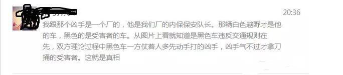 我跟那个凶手是一个厂的,他是我们厂的内保保安队长。那辆白色越野才是他的车,黑色的是受害者的车。从图片上看就知道是黑色车违反交通规则在先,双方理论过程中黑色车一方仗着人多先动手打的凶手,凶手气不过才拿刀捅的受害者。这就是真相。
