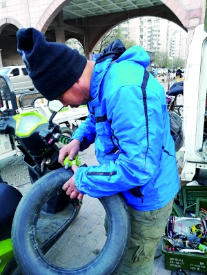 每天上午7点,何德玉准时出摊儿,直到天黑才收摊儿回家。“补自行车内胎3元,电动车内胎5元,修修补补的利润低,每换一个自行车外胎能挣10块钱。”他指着马路两侧太平家园、天通西苑两个小区说,“服务对象主要是中老年群体,他们去菜市场习惯骑自行车,年轻人更喜欢用共享单车,车子有问题也不用管”。何德玉坦言,自共享单车出现后,修车的数量少了近一半。同时,随着外卖和快递行业的兴起,何德玉又开拓了新的业务群体——骑电动三轮车的快递员、外卖小哥。百世快递公司好几次联系何德玉修车,每次“出差”两个小时能挣200多元。