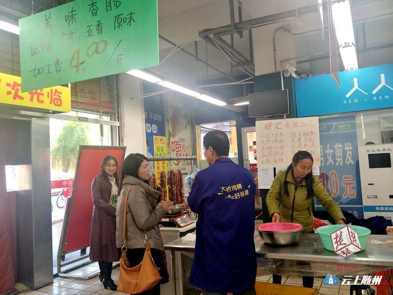 11日在一家中百仓储店内,灌腊肠的摊位已设在显眼位置,灌好的香肠样品摆在架子上,老板正在张罗生意。记者看到,该摊点香肠加工费是4元一斤,口味有五香、麻辣、广式、原味等,不少市民正在询问。