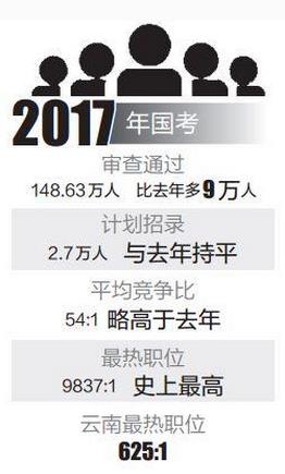 中央机关及其直属机构2017年度公务员招考网上报名和资格审查工作于26日18时结束,共有211.5万人报名,其中,148.63万人通过资格审查。