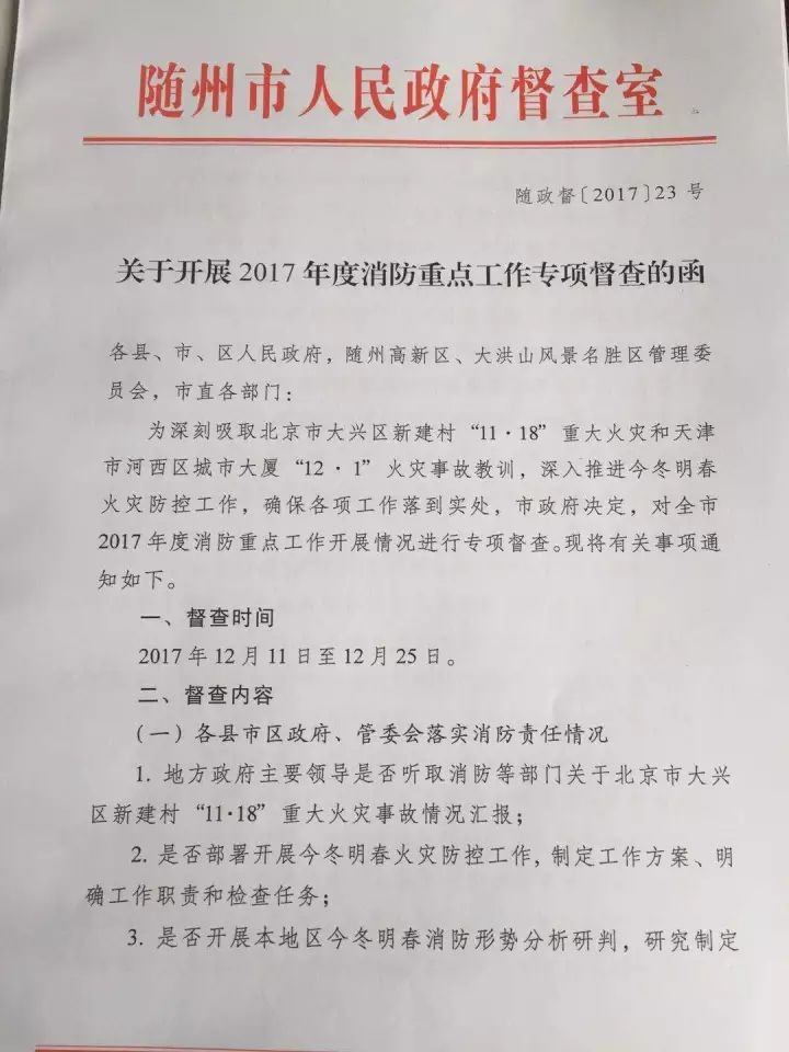 为切实做好今冬明春火灾防控工作,深入推进各地年度消防工作目标责任落实,12月11日起,随州市政府抽调政府办公室、督查室以及市经信委、市安监局、市消防支队等相关部门人员组成2个督查组,深入全市5个县市区、管委会和46个行业部门,就冬春火灾防控工作和年度重点工作完成情况进行专项督导检查