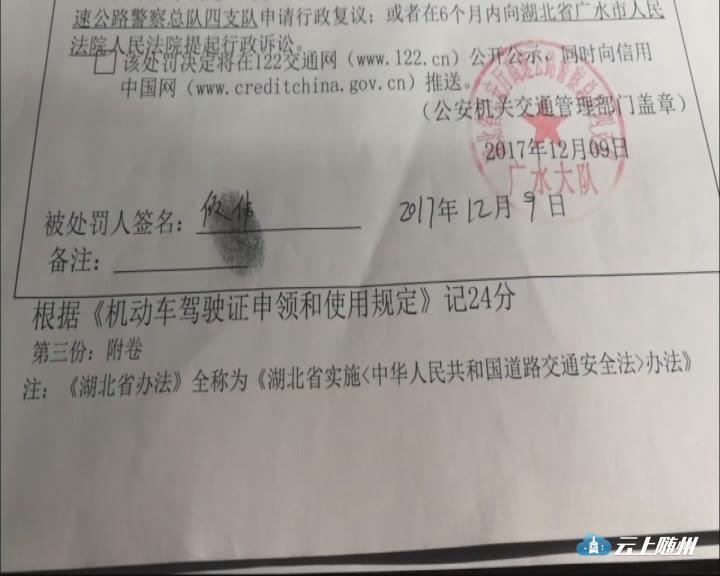 【采访】高警广水大队事故处理中队民警 黄朝杰:在检查的过程当中,发现车辆的后备箱,有一张2014年的临时牌证,上面的信息清晰的记载着车辆的车架号、发动机号和现在所开的车是对应的,在事实面前当事人承认了这辆车确实是套牌车,因为这辆车在2014年的时候就没有上过牌照。