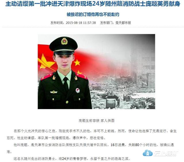 庞方国和方志英家住湖北省随州市唐县镇,2010年,他们的独子庞题参军入伍,曾是天津市公安消防总队保税支队天保大道中队班长。2015年8月12日晚天津港特大爆炸事故发生后,庞题主动请缨参与救援不幸牺牲,生命永远定格在了24岁。