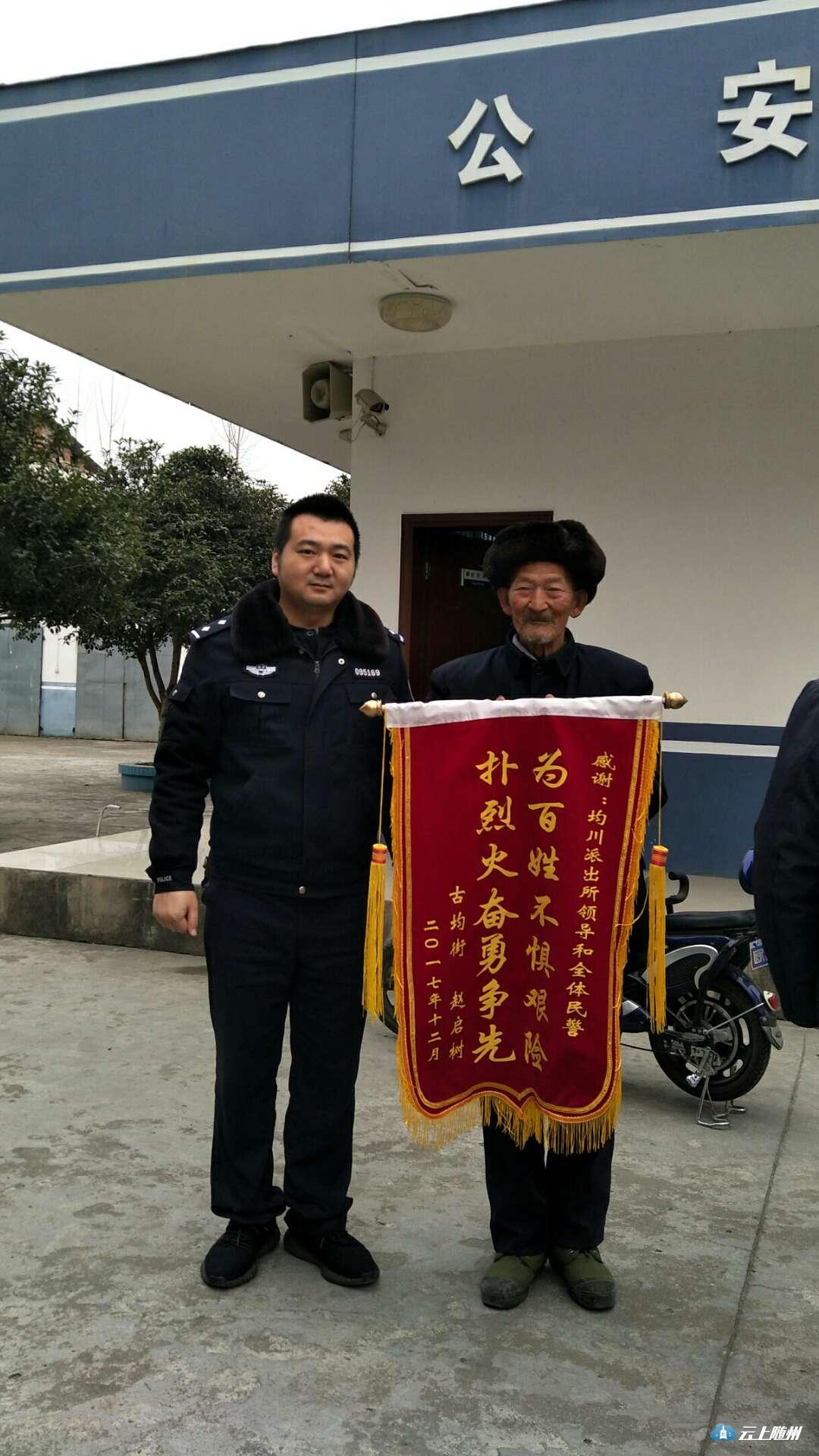 “咚咚锵,咚咚锵……”12月18日上午9时许,随县公安局均川派出所大院内响起一阵欢天喜地的锣鼓声。走在最前面的赵某某将手里捧着的一面写着“为百姓不惧艰险,扑烈火奋勇争先”的大红锦旗送到民警路晓勇手中,以表达民警对其儿子经营中意外失火的早餐店进行奋力扑救的感激之情。