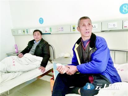 昨日上午11时许,楚天都市报记者在新洲区人民医院住院部病房内,看到了受伤的高师傅和夏爹爹,高师傅嘴唇上有伤痕,右侧肋部仍然疼痛,夏爹爹右手缠着纱布。