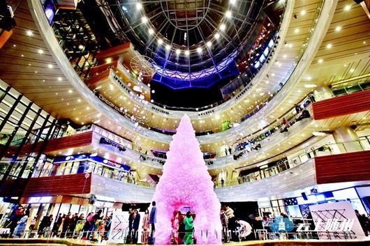 中午时分,江汉路、中山大道便迎来大批逛街人群;下午4时许,楚河汉街已是游人如织;华灯初上,中南路、街道口一带提着购物袋走出商场的人不在少数……昨日,平安夜遇上周末,武汉各大商圈璀璨炫目,到处是热闹的人群和欢乐的笑声。