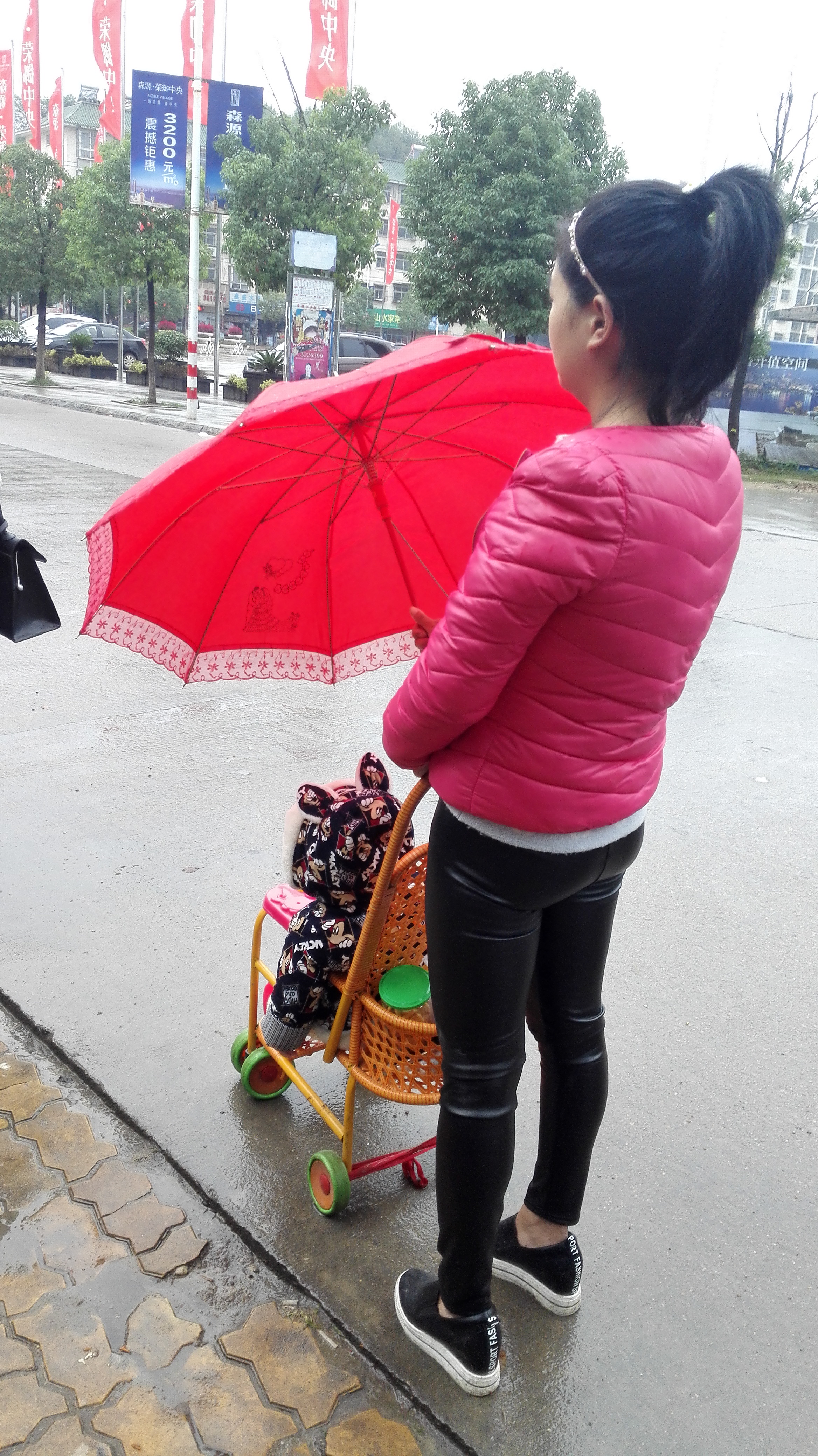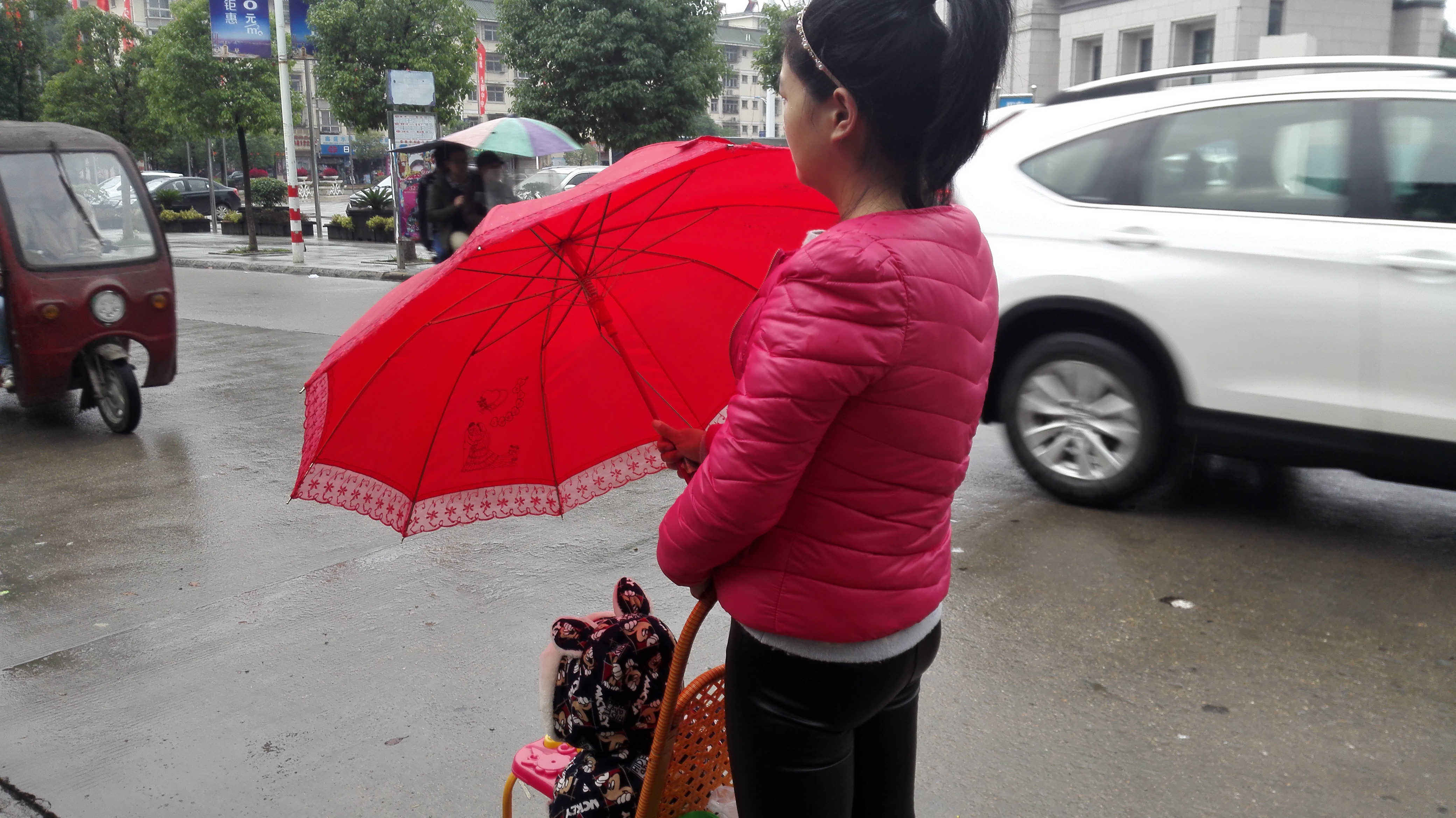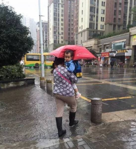 图1.2是早上在随州南郊金三角公交站牌拍的,当时天空下起了细雨,路过的行人都撑起了伞,这位年轻的妈妈也撑起了伞,但是只顾着孩子了。