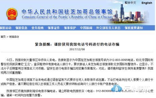 资料图:中国驻芝加哥总领馆网站发布谨防电话诈骗的安全提醒。