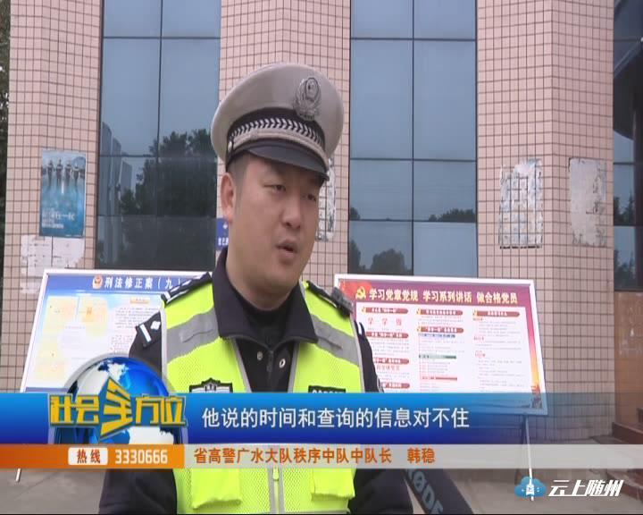 【采访】省高警广水大队秩序中队中队长 韩稳:根据我们查询的公安网信息核对,我问他什么时候拿的驾驶证,他说的时间和查询的信息对不住,然后问他的电话号码,报的号码和网上的信息也对不住,当时我就怀疑,肯定有点问题。