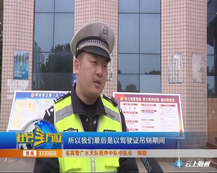 【采访】省高警广水大队秩序中队中队长 韩稳:经过我们网上查询,他是酒驾了,一直没有去处理,驾驶证被交警队暂扣了,从2014年到2017年12月11日,他的驾驶证被暂扣已经有三年了,根据相关的法律规定,这个驾驶证超过三年,没有及时去学习缴纳罚款,驾驶证是要被强制吊销的,所以我们最后是以驾驶证吊销其间驾驶机动车处以800元的罚款,并且行政拘留三日。