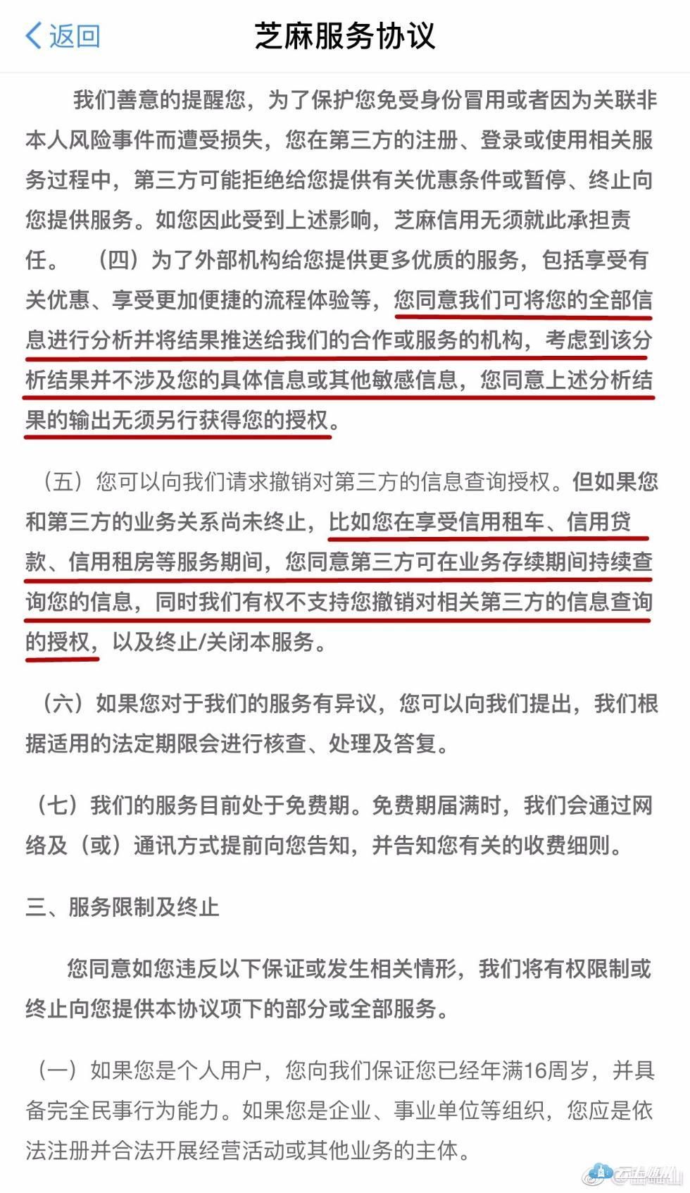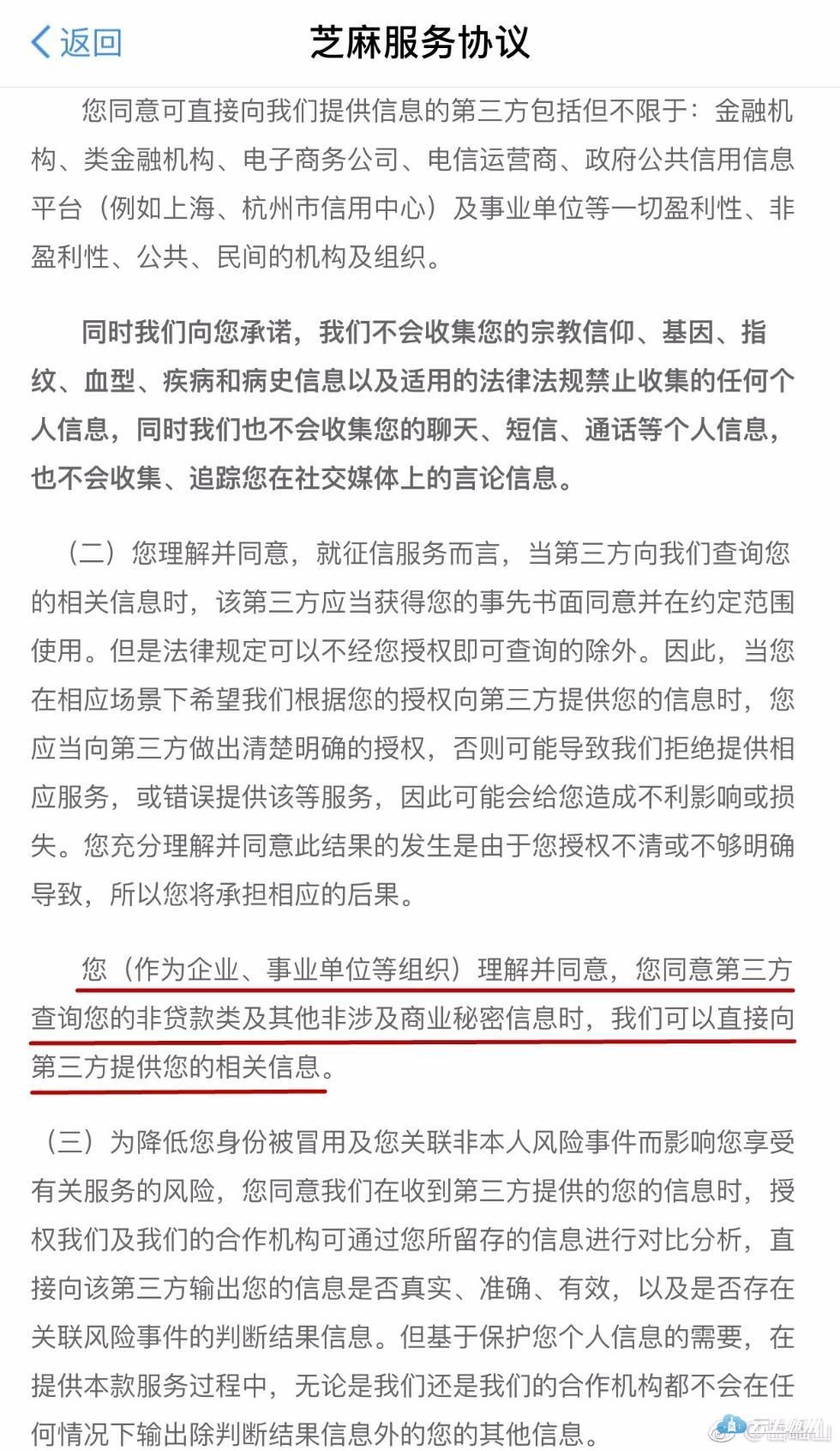 岳屾山在微博中说,根据《互联网交易管理办法》的规定,经营者应当采用显著的方式提请消费者注意与消费者有重大利害关系的条款。同时对于信息收集,该规定要求经营者需要明示收集、使用信息的目的、方式和范围,并经被收集者同意。而“芝麻”这个根本不给你了解条款的机会,直接让你默认同意,稍不注意就进坑了。