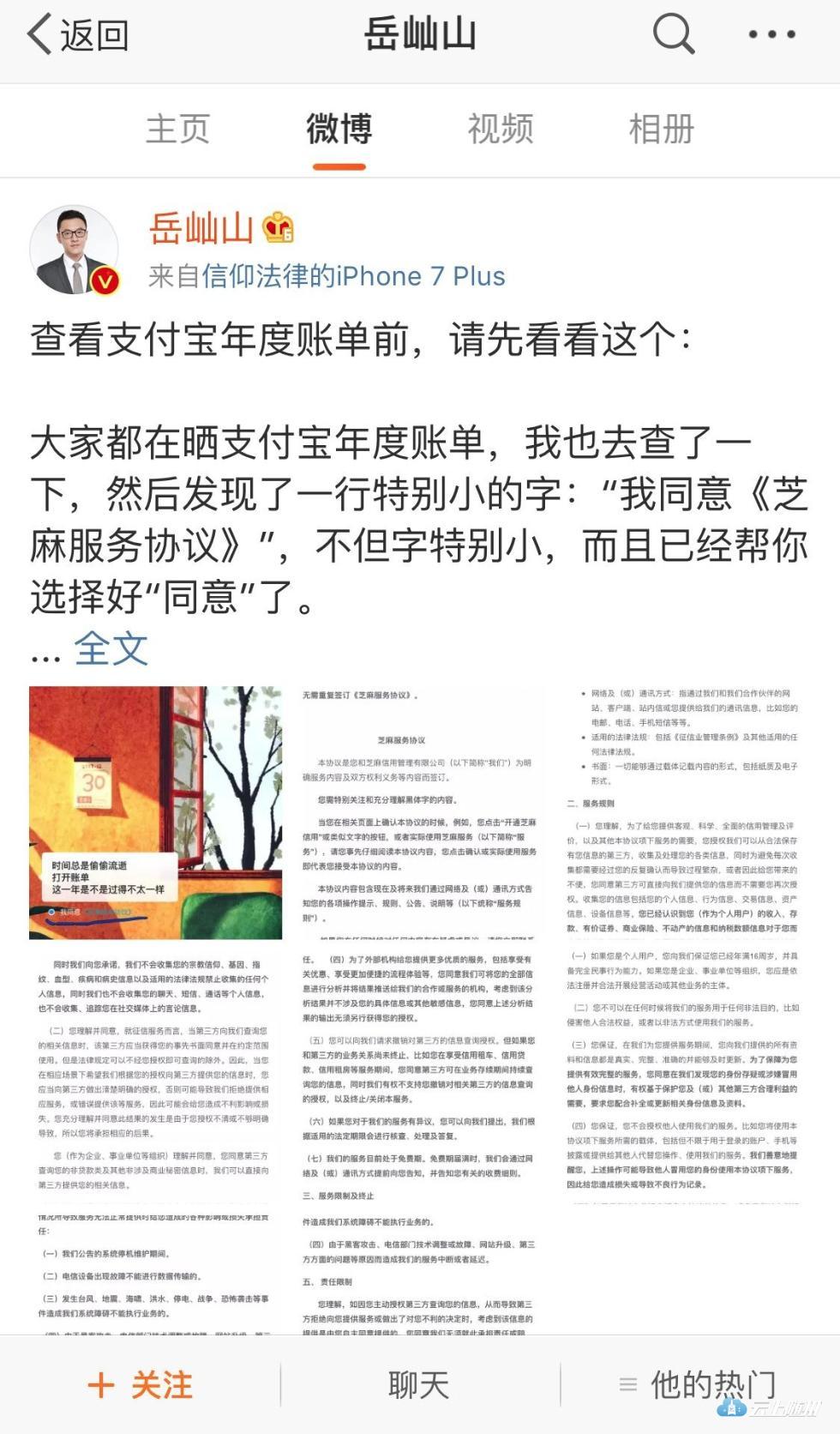 据岳屾山介绍,这个账单的查看和《芝麻服务协议》没有关联性,所以你选择取消同意,依然能够看到年度账单。但如果你没注意到,就会直接同意这个协议,允许支付宝收集你的信息包括在第三方保存的信息。