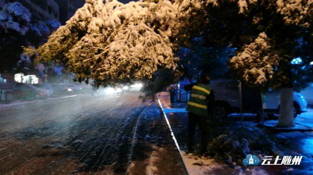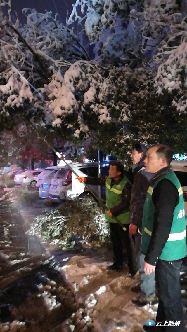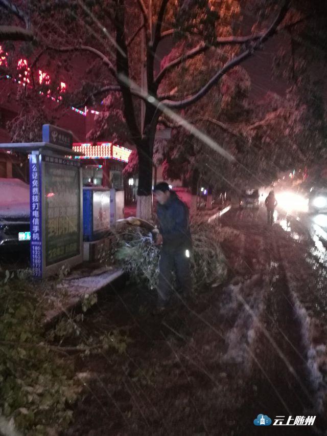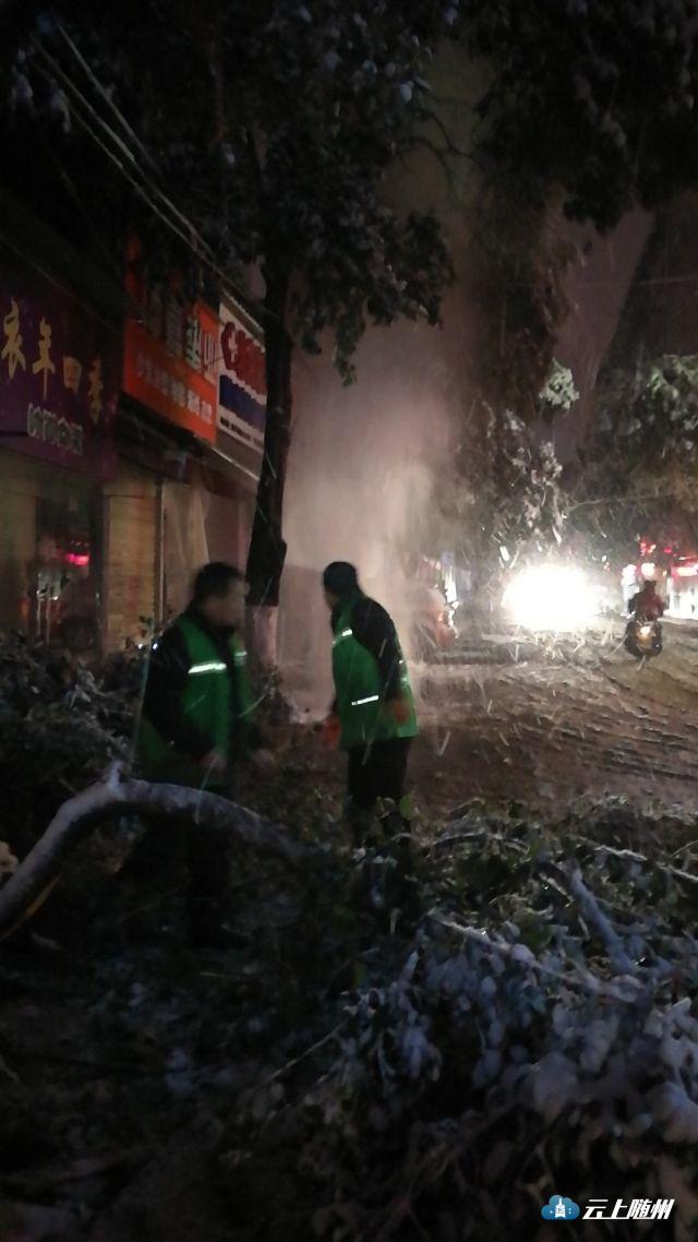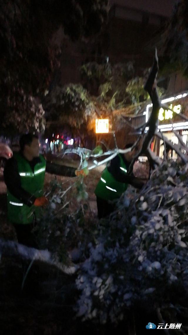 昨夜的大雪压断行道树,阻碍交通,园林绿化处工作人员连夜清障,确保车辆行人畅通