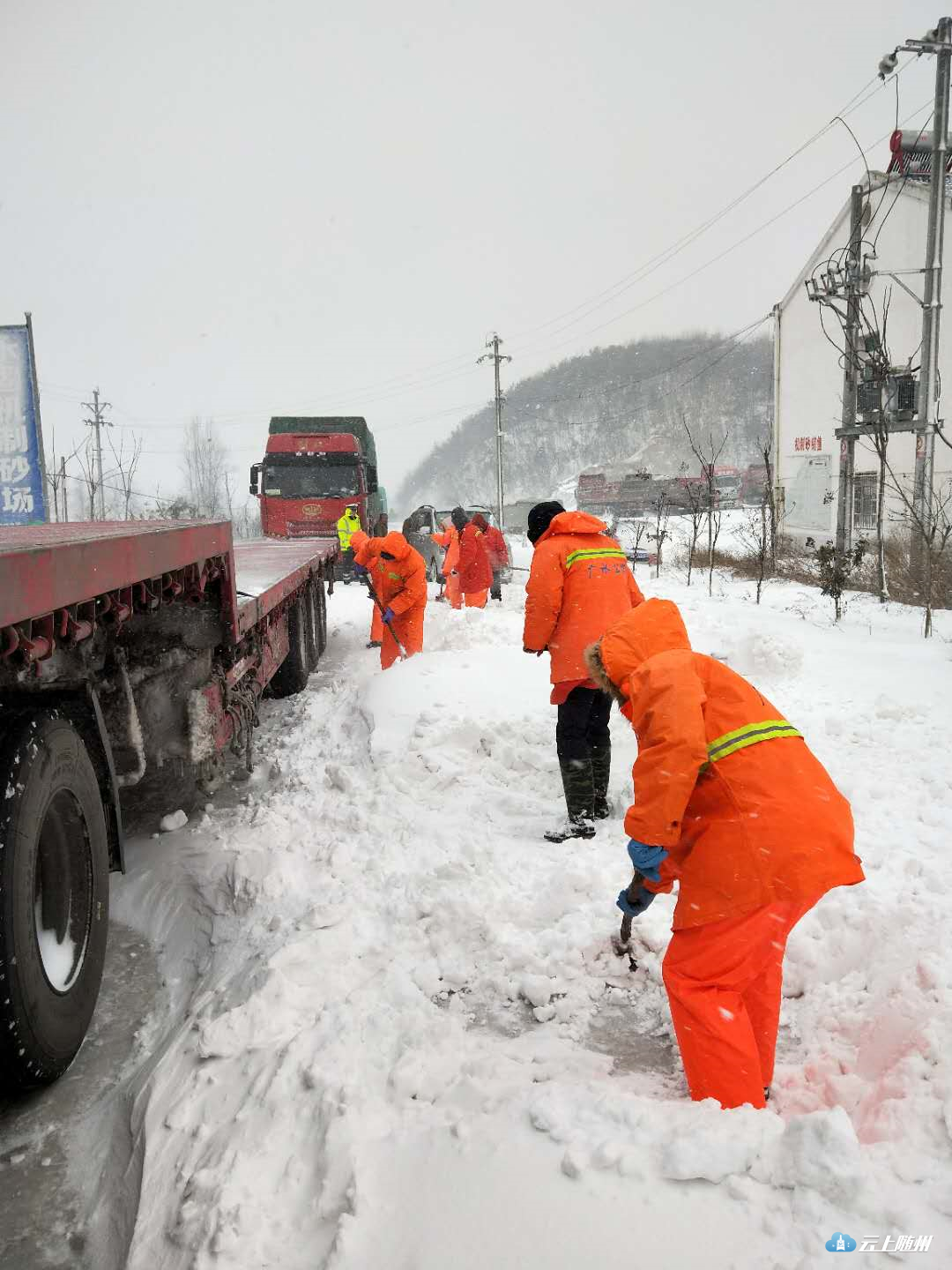 在平洑线上,由于风雪交加路面温度太低,降下的雪花如不及时消融,很快就会结冰,影响道路通行。公路养护人员顶风冒雪,将化雪盐撒向路面。漫天风雪中,公路路政人员不时上前提醒过往司机注意交通安全。