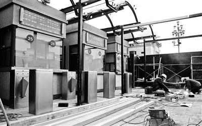 昨天下午,北青报记者在北京站站前广场看到,进站口西侧已经被施工围挡封住,里面的工人师傅正在进站口安装“刷脸”自动检票闸机。6台新设备将于本月底安装完毕,春运前投入使用。