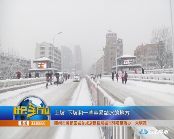 今天是我们随州市十年不遇的第一场大雪,我们曾都区城乡规划建设局组织中标的环卫保洁公司,制定了预案,准备了十多吨的盐,对道路结冰,主要地方和桥梁,上坡,下坡,和一些容易结冰的地方进行了撒盐溶雪,组织了500多环卫工人从昨天开始一直到今天早上六点继续上路,连续作业,确保城市道路的畅通。