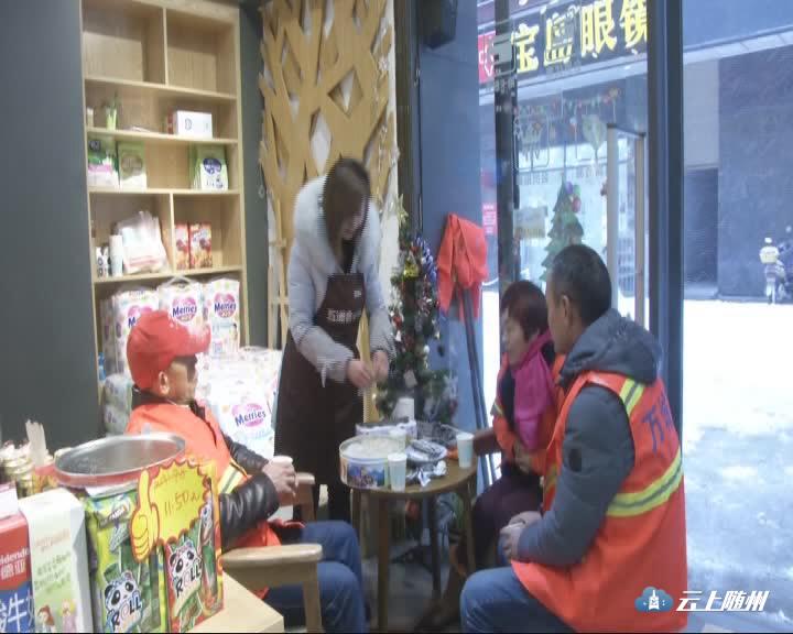 虽然说我们环卫工人很辛苦,下这么大的雪,从昨天晚上开始,到今天,我们环卫工人,冒着鹅毛大雪,一样在室外工作,为城市市民,创造好的环境,也得到市民商家的理解,她们提供食品,热饮料为我们环卫工人,体贴我们环卫工人,我们环卫工人很感激这些商家,下一部工作,我们环卫工更加努力的,把城市的环境卫生做好,得到市民的认可。