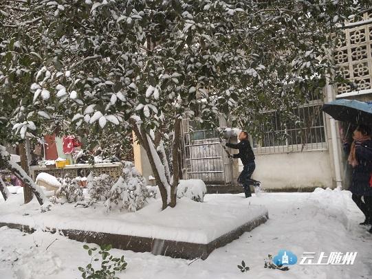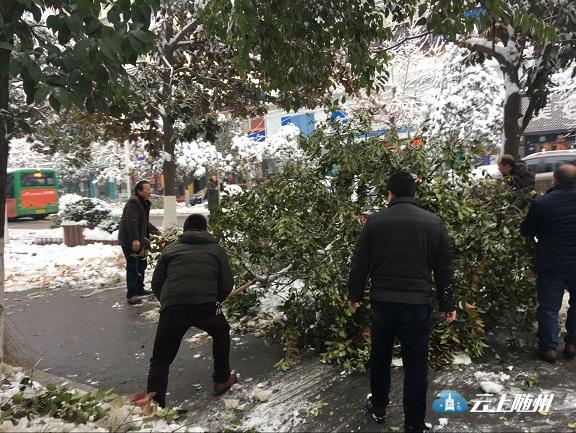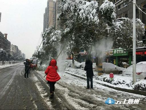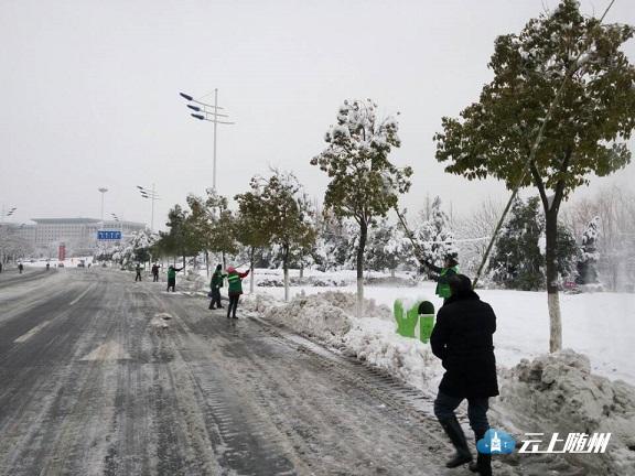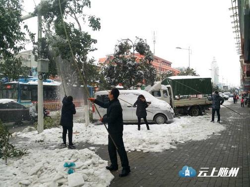 市市场站干部职工全员出动,对舜井大道的行道树及汉东路至拦河坝之间舜井道两旁200余棵树木上的积雪进行了清除。