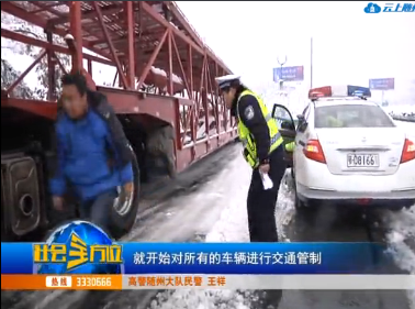 (采访:高警随州大队民警 王祥)从2号晚上开始,我们就积极地协调路政养护以及施工单位加派人手,积极调用其他单位的铲雪车,上高速公路进行作业,铲除冰雪,这是第一。第二,我们高速交警对滞留的车辆采取压速带道的形式,将滞留车辆带离高速,让他们走国道。第三,我们高警随州大队全体民警分成七个组,对路面进行巡逻管控,及时化解险情。由于路面上仍有不少积雪结冰路段,因此小型车辆还是不能上高速,但不少车主不了解路况及管控信息,仍然将车子开到收费站前,准备上高速。高警及路政工作人员向他们一一解释,帮他们指明其他道路,司机们都对此予以理解。一位湖南的车主一周前来到随州,原本想走高速去武汉,得知路面管制情况,决定走国道。