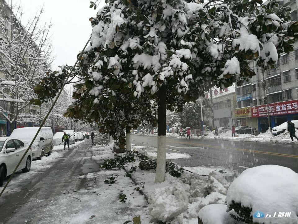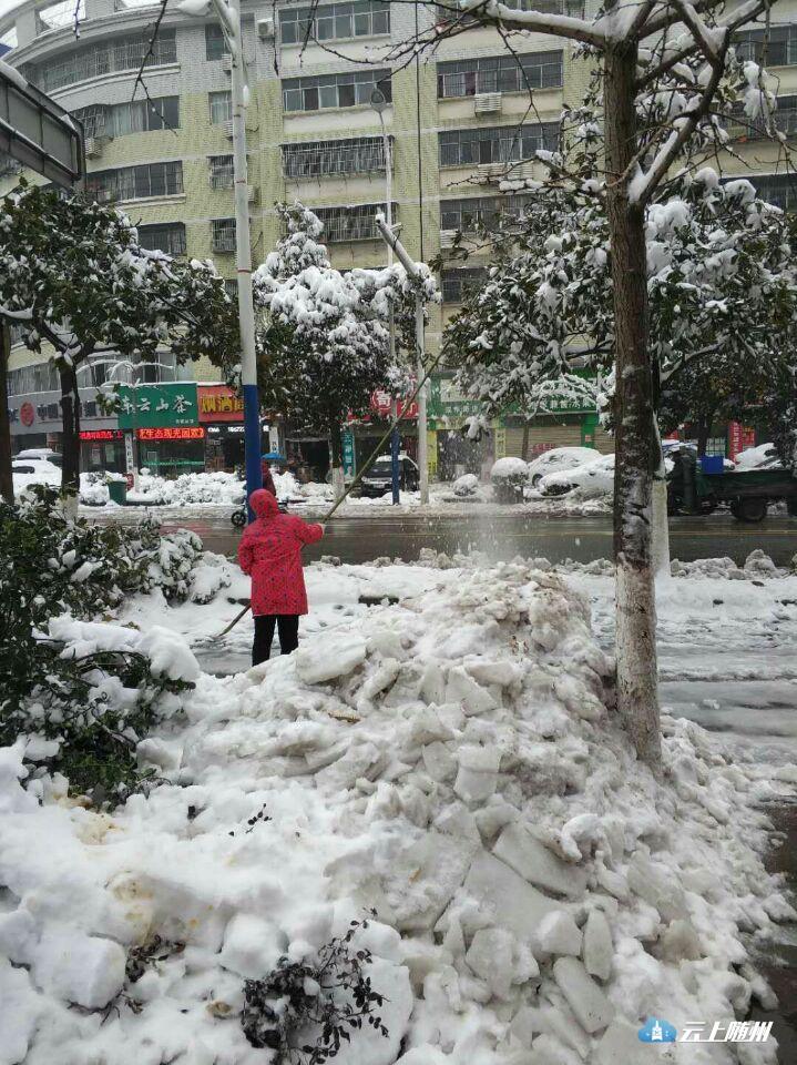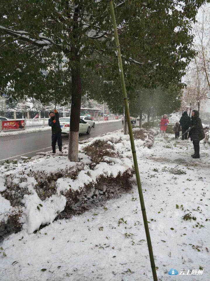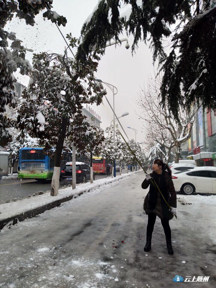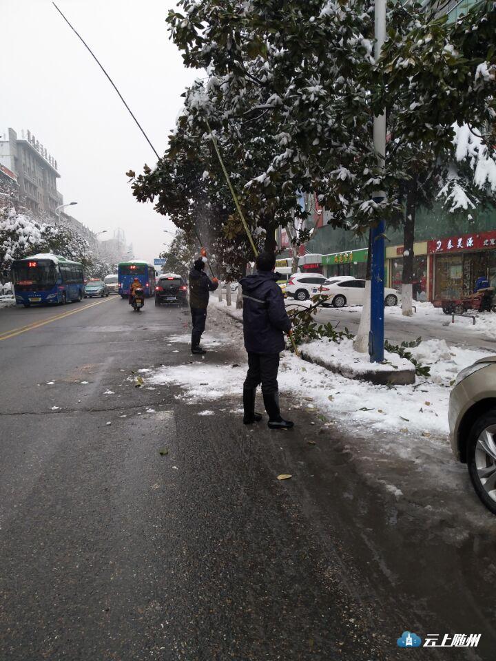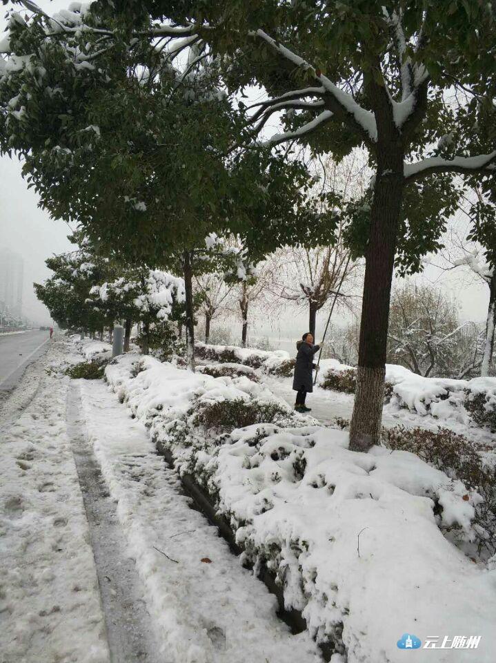 1月6日,市绿化管理处支部书记李东率先垂范,雪雨中带领处机关后勤全体工作人员对汉东路及东大堤乔木积雪进行清理工作。