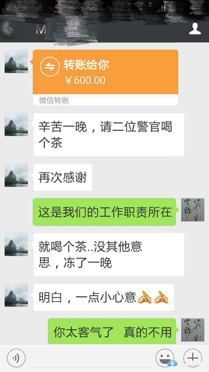 马某临走时十分感动,连声向民警道谢,并通过微信发红包给民警阳俊以表示感谢。阳俊婉言谢绝,他说:“济危扶困是人民警察义不容辞的责任,是我们的工作职责所在,这是我应该做的。